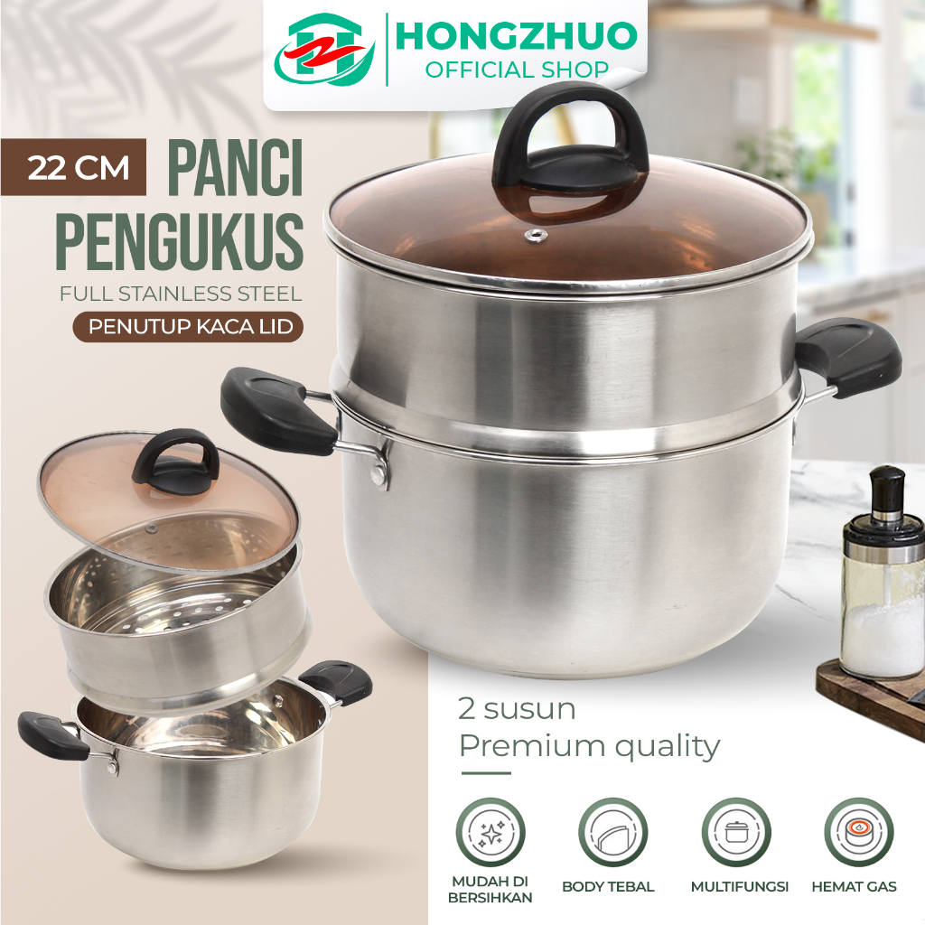 Beli Hongzhuo Panci Kukus Steam Pot 2 Tingkat Full Stainless Steel 22cm Tutup Kaca di sini
